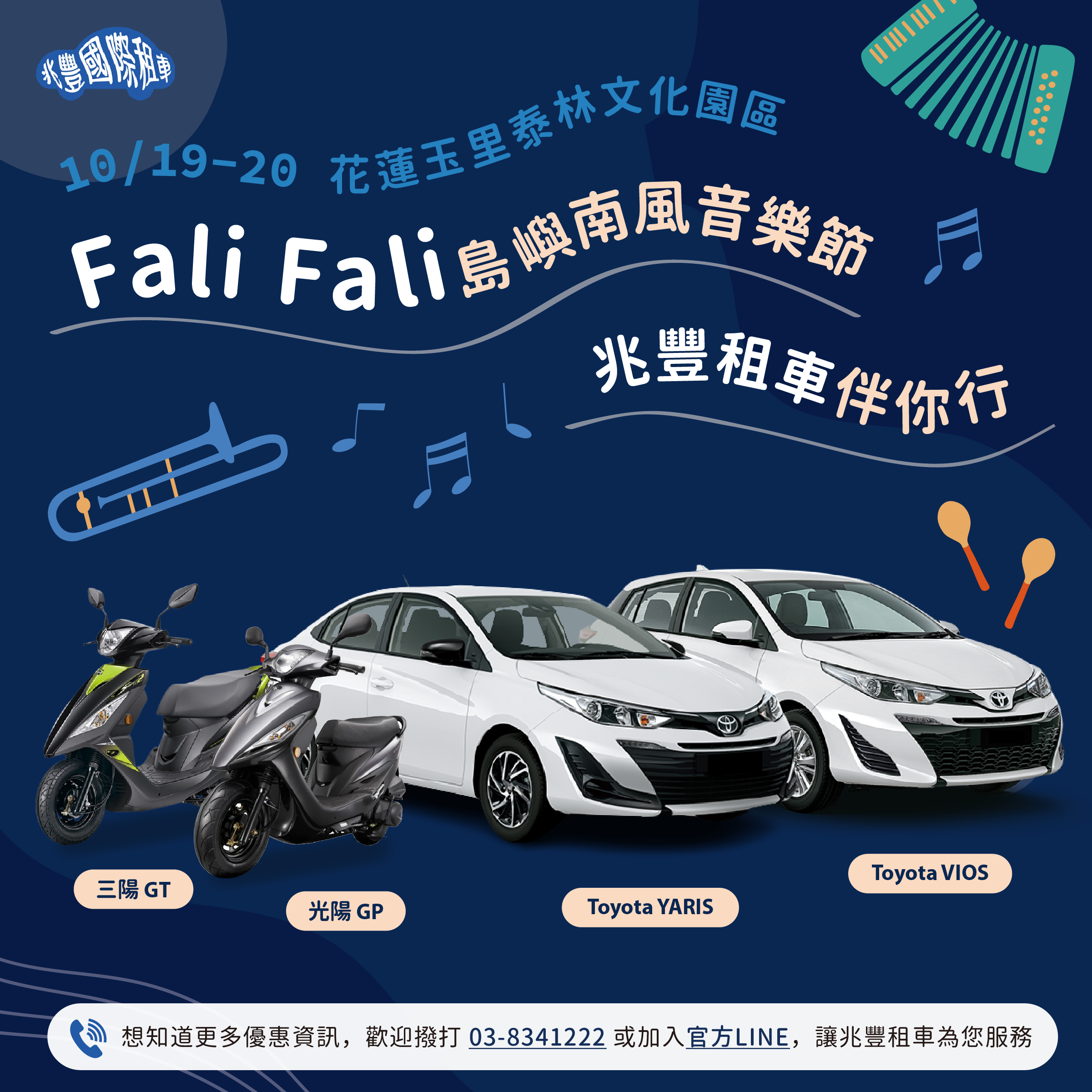 想要隨時掌握花蓮租車優惠,推薦您隨時鎖定花蓮兆豐租車粉絲專頁,並加入花蓮兆豐國際租車 LINE 官方帳號,我們將不定期提供吸引人的優惠,讓您在花蓮輕鬆租車,享受便捷舒適的旅程! 除了價格實惠外,我們的車輛經過嚴格的檢查和維護,確保每一輛車都處於最佳狀態,以保障您的安全和舒適;花蓮兆豐租車的專業服務團隊,也將全面支援您的旅程,隨時回應您的需要,致力提供您最優質的體驗。
