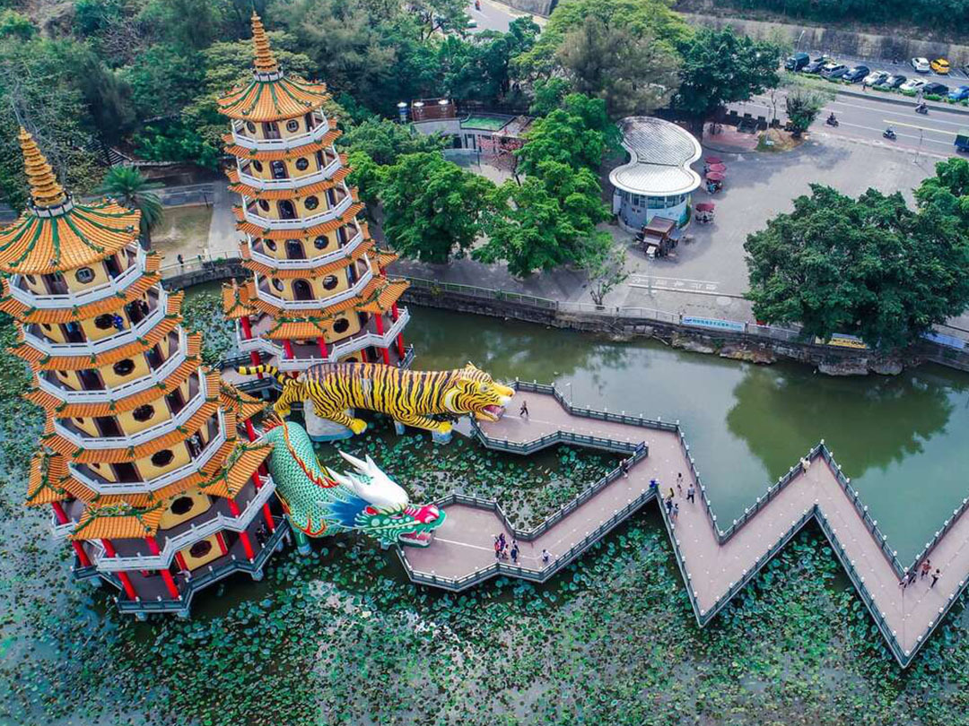 龍虎塔建於1976年,高7層的塔可由龍口進、虎口出,龍塔內壁畫有勸世故事的交趾陶作品,出自名家之手,塔身與九曲橋相銜、相映湖面成美景。據說參觀龍虎塔有規矩,要從龍口進入、虎口出來,意即「入龍喉出虎口」,就能趨吉避凶,登上塔頂即能一覽蓮池潭美景全貌。